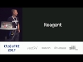Reagent is a framework used to create React applications in native ClojureScript. Re-frame offers a state container framework that is often used with Reagent.